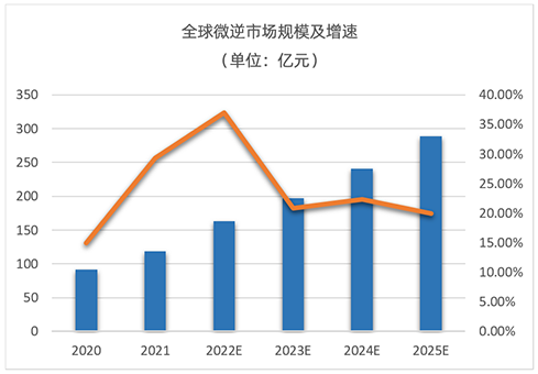 在双碳背景下,分布式光伏成为扩大我国光伏发电应用规模的重要抓手,而微型逆变器作为分布式发电系统的主要技术方案之一,凭借其安全、高效、智能、可靠、便捷等优势,逐步在分布式光伏应用场景中成为优选。预计到2025年,全球微型逆变器市场将增长至300亿元左右,市场空间广阔。